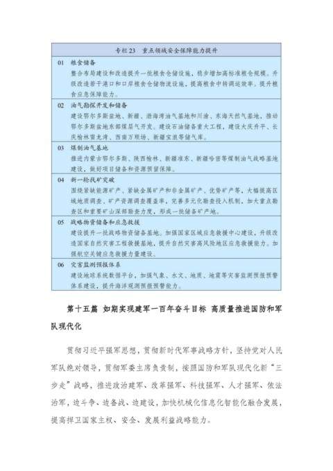 第十五篇 如期实现建军一百年奋斗目标 高质量推进国防和军 队现代化 贯彻习近平强军思想,贯彻新时代军事战略方针,坚持党对人民 军队绝对领导,贯彻军委主席负责制,按照国防和军队现代化新“三 步走”战略,推进政治建军、改革强军、科技强军、人才强军、依法 治军,边斗争、边备战、边建设,加快机械化信息化智能化融合发展, 提高捍卫国家主权、安全、发展利益战略能力。