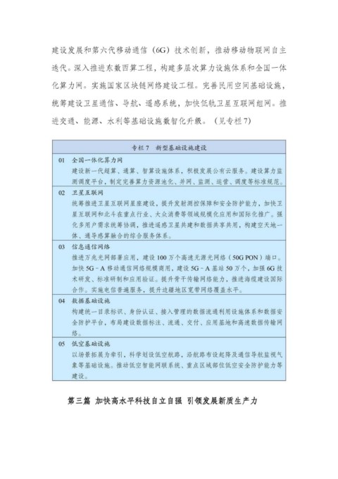 建设发展和第六代移动通信(6G)技术创新,推动移动物联网自主 迭代。深入推进东数西算工程,构建多层次算力设施体系和全国一体 化算力网。实施国家区块链网络建设工程。完善民用空间基础设施, 统筹建设卫星通信、导航、遥感系统,加快低轨卫星互联网组网。推 进交通、能源、水利等基础设施数智化升级。(见专栏 7) 第三篇 加快高水平科技自立自强 引领发展新质生产力
