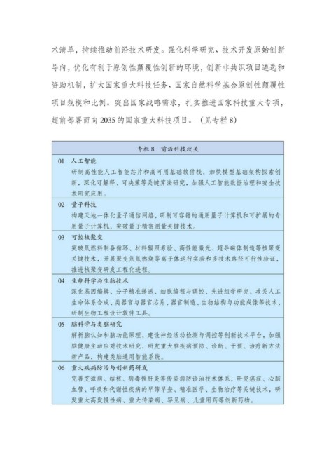 术清单,持续推动前沿技术研发。强化科学研究、技术开发原始创新 导向,优化有利于原创性颠覆性创新的环境,创新非共识项目遴选和 资助机制,扩大国家重大科技任务、国家自然科学基金原创性颠覆性 项目规模和比例。突出国家战略需求,扎实推进国家科技重大专项, 超前部署面向 2035 的国家重大科技项目。(见专栏 8)