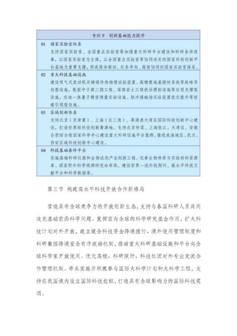 第三节 构建高水平科技开放合作新格局 营造具有全球竞争力的开放创新生态,支持与各国科研人员共同 攻克基础前沿科学问题。发挥面向全球的科学研究基金作用,扩大科 技计划对外开放,建立健全科技资金跨境拨付、境外使用管理制度和 科研数据跨境安全有序流动机制,推动重大科研基础设施和平台向全 球科学家开放使用。优化高校、科研院所、科技社团对外专业交流合 作管理机制。牵头实施并积极参与国际大科学计划和大科学工程,支 持在我国境内设立国际科技组织,打造具有全球影响力的国际科技奖 项。
