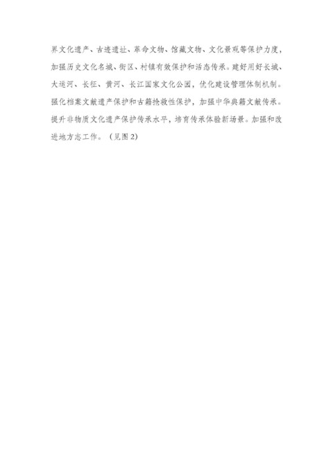 界文化遗产、古迹遗址、革命文物、馆藏文物、文化景观等保护力度, 加强历史文化名城、街区、村镇有效保护和活态传承。建好用好长城、 大运河、长征、黄河、长江国家文化公园,优化建设管理体制机制。 强化档案文献遗产保护和古籍抢救性保护,加强中华典籍文献传承。 提升非物质文化遗产保护传承水平,培育传承体验新场景。加强和改 进地方志工作。(见图 2)