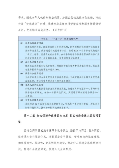 需求。强化老年人优待和权益保障。加强公共设施适老化改造,持续 开展“智慧助老”行动,推动涉老高频事项便捷办理和服务场景简便 易用,发展综合为老服务。(见专栏 17) 第十二篇 加大保障和改善民生力度 扎实推进全体人民共同富 裕 坚持在高质量发展中保障和改善民生,坚持尽力而为、量力而行, 健全基本公共服务体系,实施更加公平普惠、精准有力的社会政策, 加强普惠性、基础性、兜底性民生建设,解决好人民群众急难愁盼问 题,畅通社会流动渠道,提高人民生活品质。