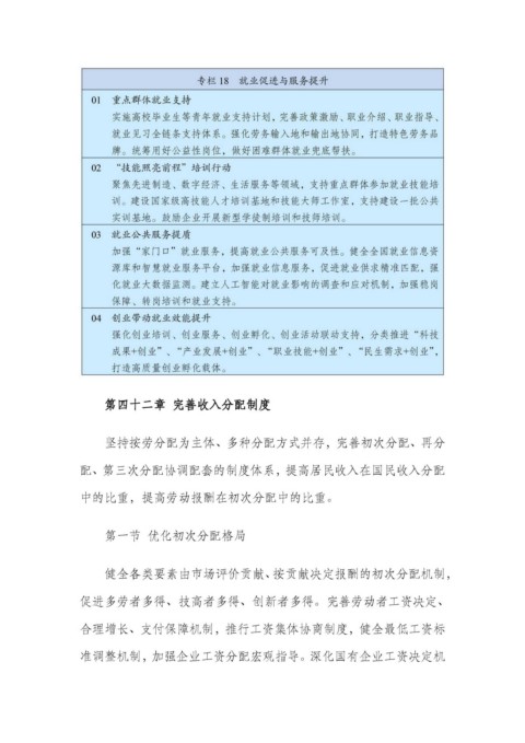 第四十二章 完善收入分配制度 坚持按劳分配为主体、多种分配方式并存,完善初次分配、再分 配、第三次分配协调配套的制度体系,提高居民收入在国民收入分配 中的比重,提高劳动报酬在初次分配中的比重。 第一节 优化初次分配格局 健全各类要素由市场评价贡献、按贡献决定报酬的初次分配机制, 促进多劳者多得、技高者多得、创新者多得。完善劳动者工资决定、 合理增长、支付保障机制,推行工资集体协商制度,健全最低工资标 准调整机制,加强企业工资分配宏观指导。深化国有企业工资决定机