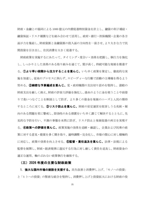 と「ヒトへの投資」の緊密な統合を堅持し、消費押し上げと投資拡大における財政の役