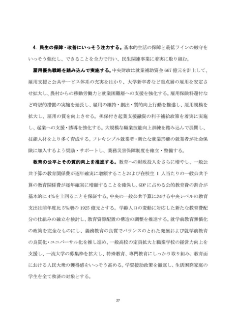4.民生の保障・改善にいっそう注力する。 基本的生活の保障と最低ラインの厳守を