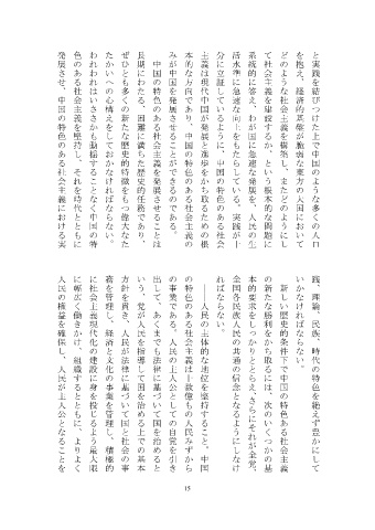 国の 特色 のあ 発展 させ 、中 に おけ る実 る社 会主 義 時代とともに 、それを 色のある社会主義 を堅持し と 動揺するこ の特 なく中国 われ われ かも はいささ の心 構え をして た か いへ な らな い。 お かなけれ ば 多く の新 とも ぜひ もつ 偉大 なた たな 歴史 的特徴を 満ち た 難に る 、困 あ り、 任務で 歴 史的 た 長期 にわ る の で き る 。 で あ を発展 さ みが中 国 せ と が る こ あり 、中 国の 本 的 向で な方 会主 義 る社 特色 のあ の 国が 発展 主義 は現代中 と進 ち 取るための根 歩を か に、中国の特色のある社会 いるよう て 分に立証し が十 る。実践 活水準に急速な向上をもたらしてい 民 の生 を、人 発 展 的に答え 系統 、 が国に急 わ 速な 題に 会主義を
