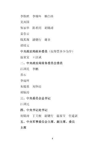 李铁映 李瑞环 杨白冰 吴邦国 邹家华 陈希同 胡锦涛 姜春云 钱其琛 尉健行 谢非 谭绍文 中央政治局候补委员(按得票多少为序) 温家宝 王汉斌 二、中央政治局常务委员会委员 江泽民 李鹏 乔石 李瑞环 朱镕基 刘华清 胡锦涛 三、中央委员会总书记 江泽民 四、中央书记处书记 胡锦涛 丁关根 尉键行 温家宝 任建新 五、中央军事委员会主席、副主席、委员 主席 2